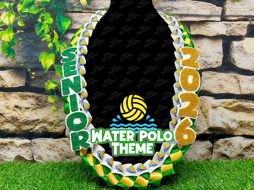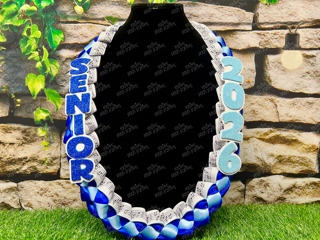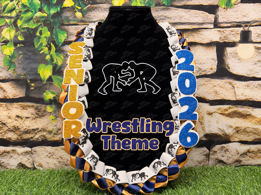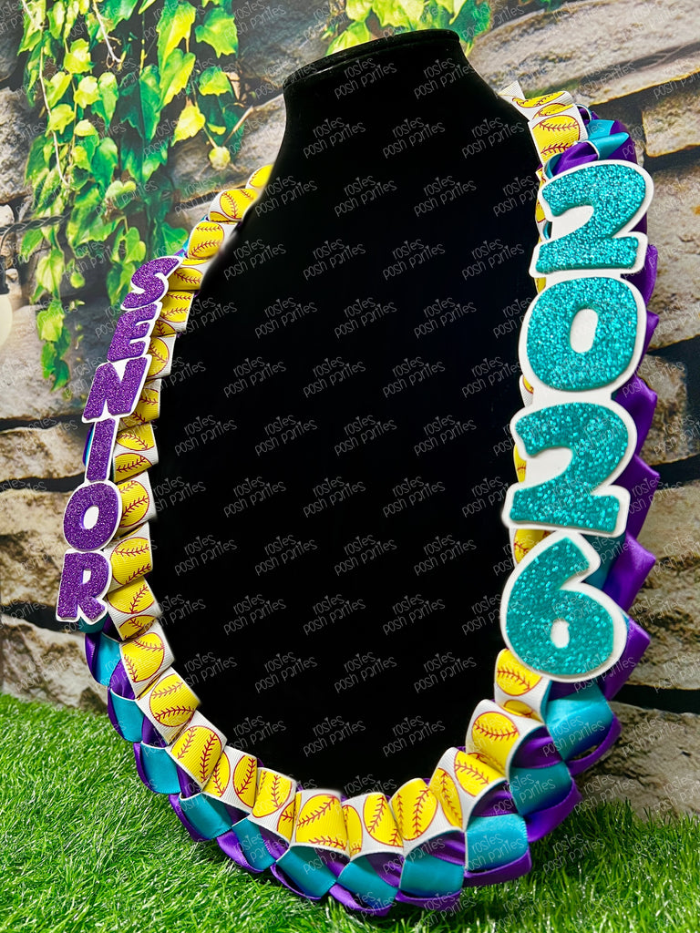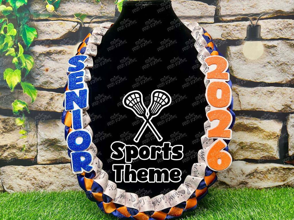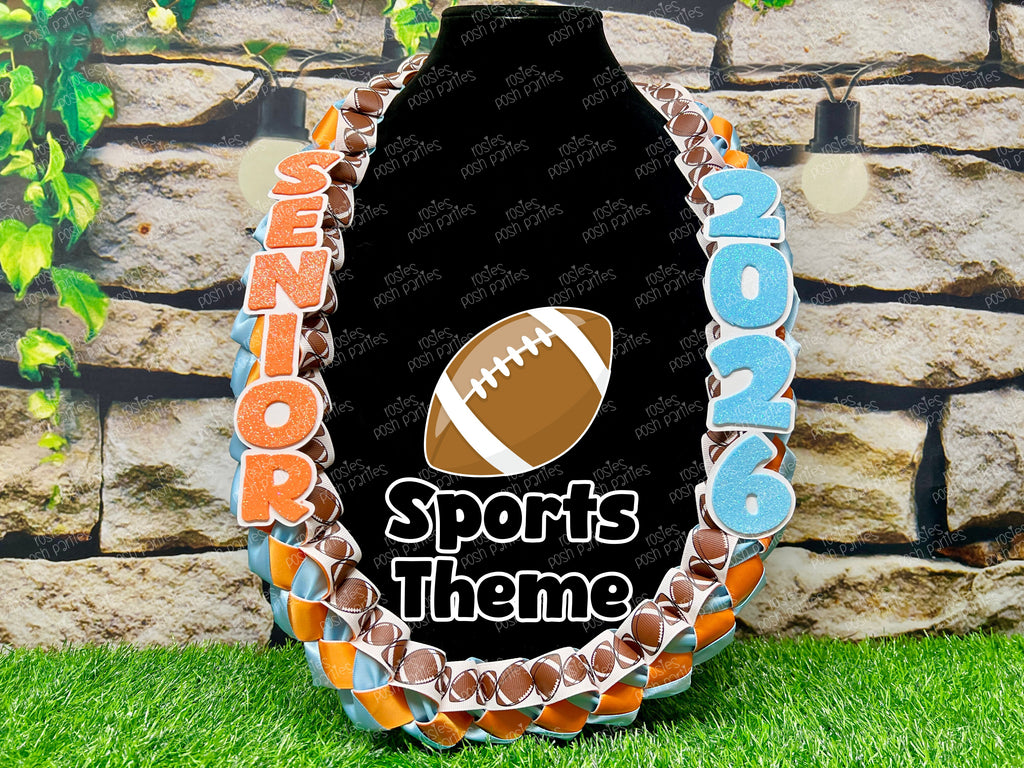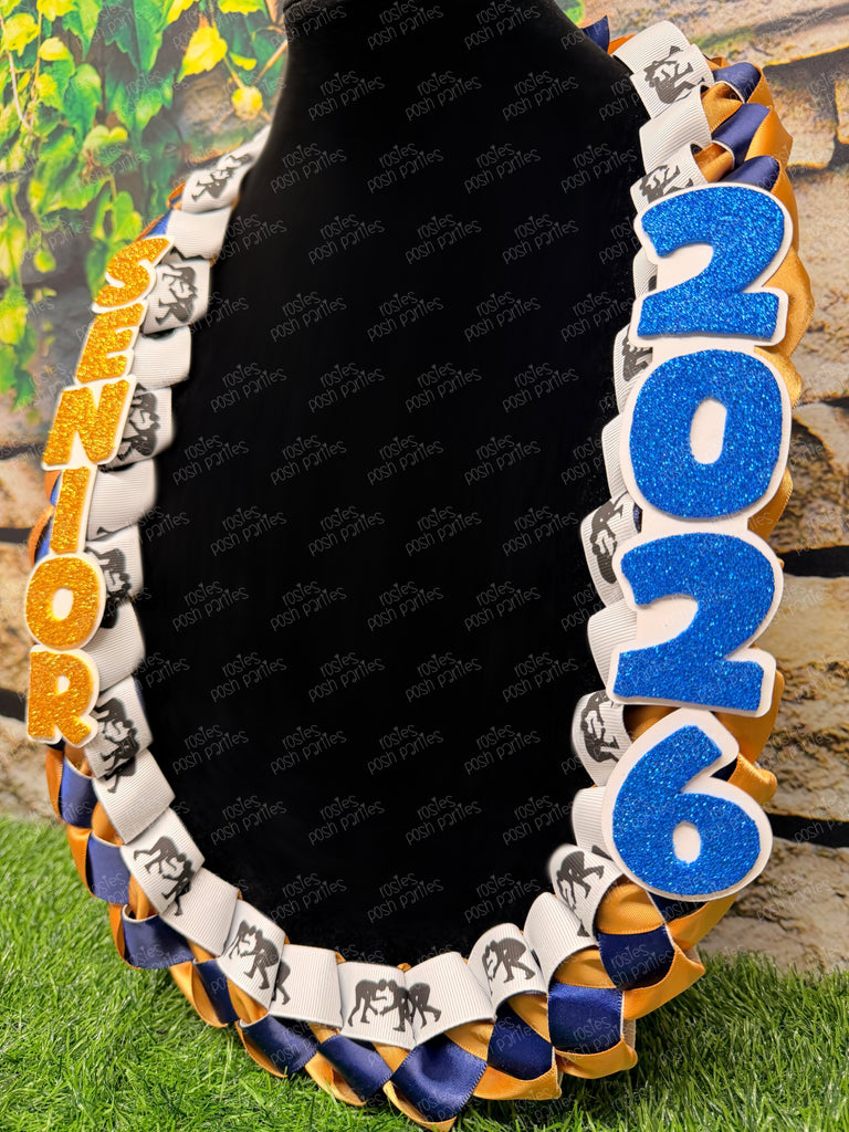 All soon to be grads love receiving these ribbon leis on Senior Night! These come with the sports ribbon braided between the two satin ribbon colors of your choice. One side reads SENIOR and the other reads the grad year!